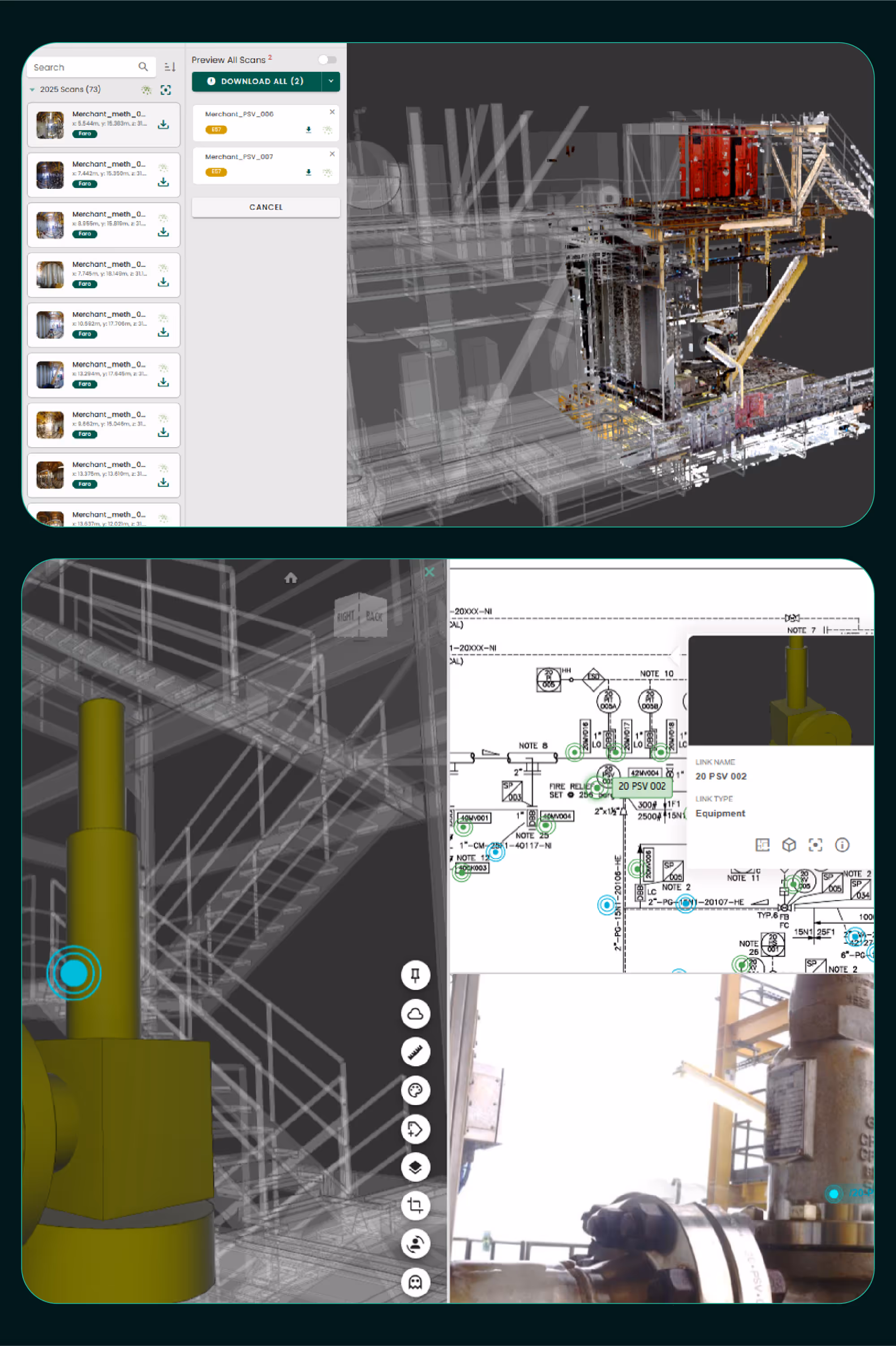 AVA gives engineering, inspection, construction, and operations teams a shared, real-time view of the asset, using the 3D model, point cloud, and 360° capture aligned to plant coordinates. Teams can review, plan, and make decisions from anywhere, without stepping onto site.